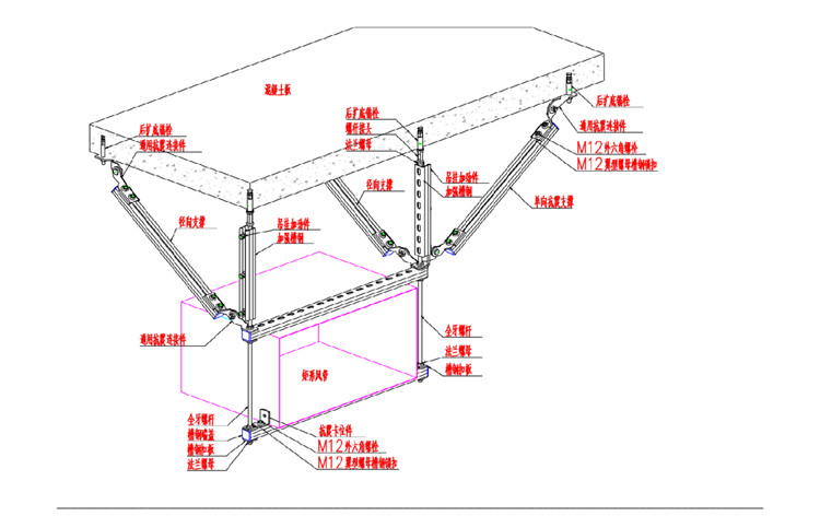 管道抗震支架一般分為側向抗震支吊架和側縱向抗震支吊架。一般采用膨脹錨栓、全螺紋螺桿、連接構件、角鋼或C型槽鋼和U型管夾,支吊架間距可根據實際情況調整,不大于規定的安裝間距。